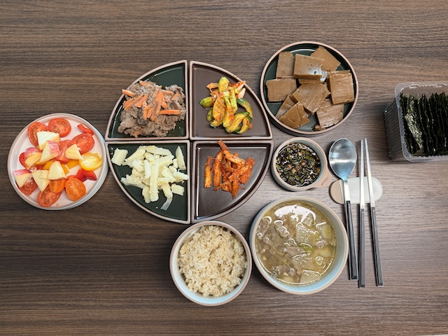 제가 사진찍는 걸 자주 까먹어서 차려주신 점심 사진이 하나 있어서 올려봅니다. 제가 슴슴하게 먹는 것을 좋아해서 거기에 맞춰 준비해주신 음식이예요.