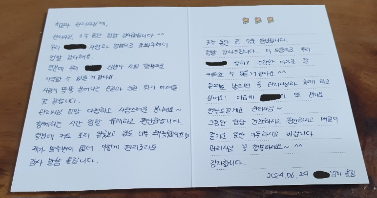둘째 낳으면 그때도 부탁드린다고 미리 찜꽁해두는 마음으로 마지막날 편지도 써서 드렸어요ㅎㅎ